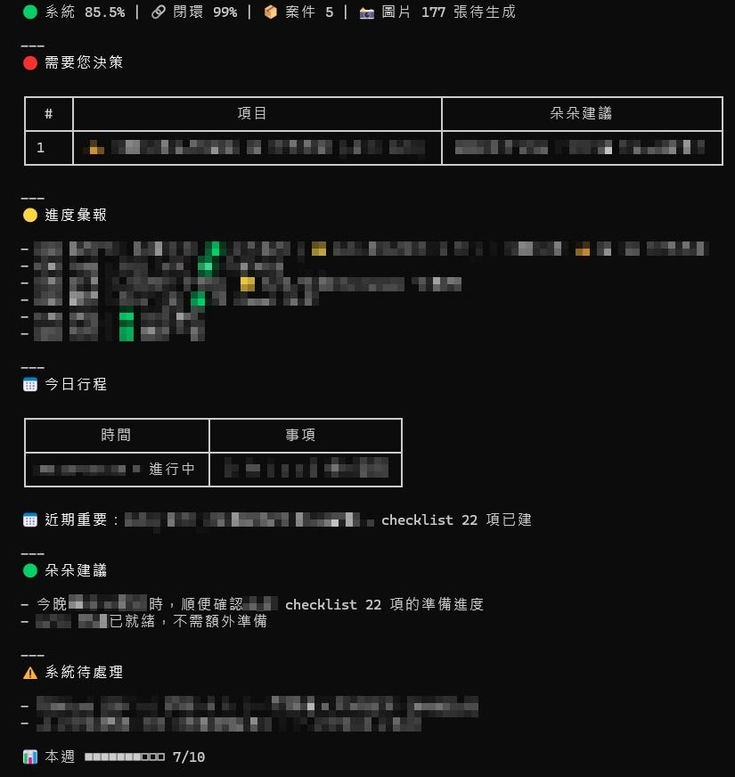我跟他有一個制式的規範模板,啟動時會要求他 > 先至我的google行事曆讀取當日行程 > 讀取我的 ToDoList > 依照模板輸出今日的開啟格式,並建議我怎麼執行。