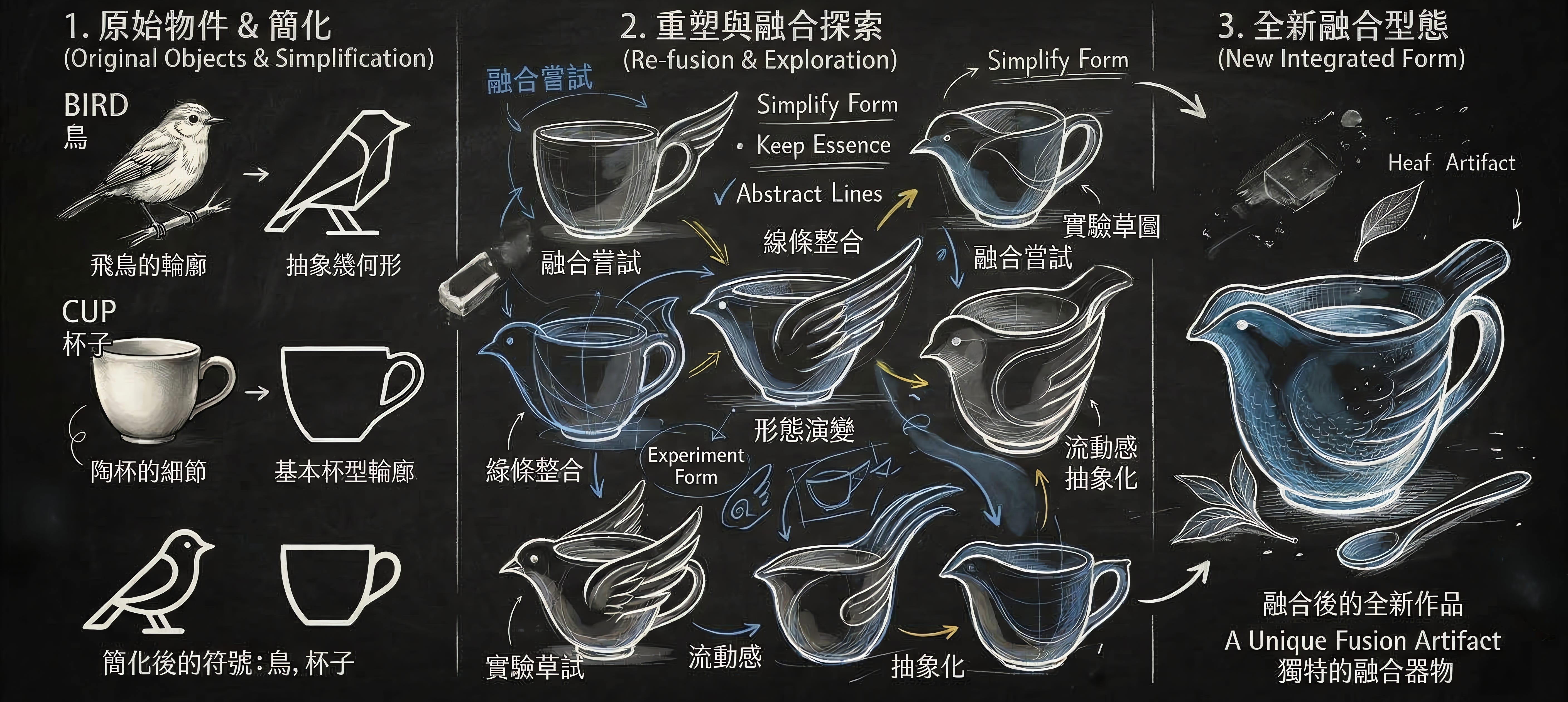 我覺得這樣的思考很像大學的時候,老師在教我怎麼做設計。他說:「有一種手法是我們先把一個東西的符號簡化,像是一隻鳥跟一個杯子,我們可以只取他的形,然後試著去重新融合它,把它塑造成一個全新的型態。」
